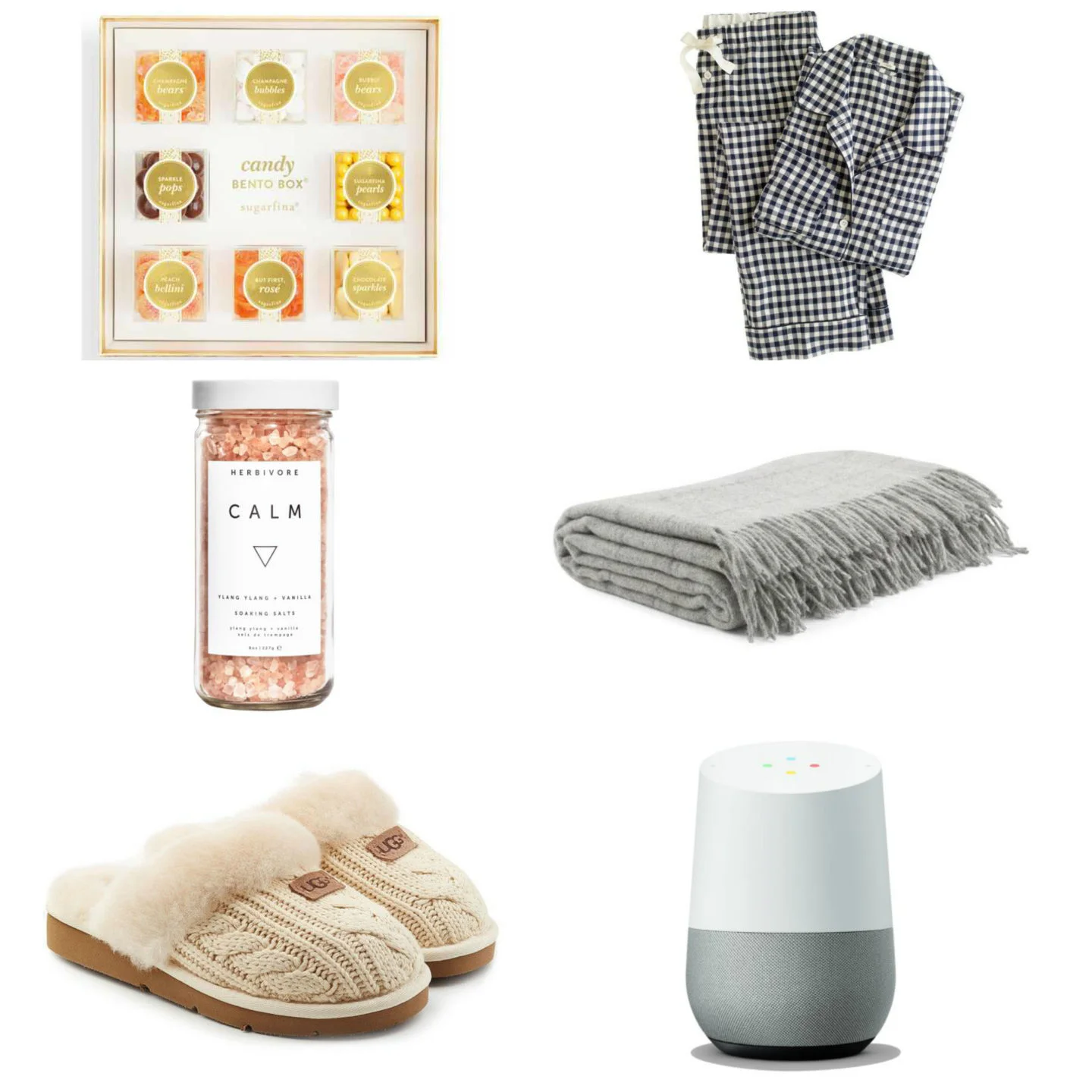 Sugarfina Bento Box // JCrew Flannel Pajama Set // Herbivore Botanicals ‘Calm’ Bath Salts // Grey Throw// Ugg Cozy Cable Slippers // Google Home