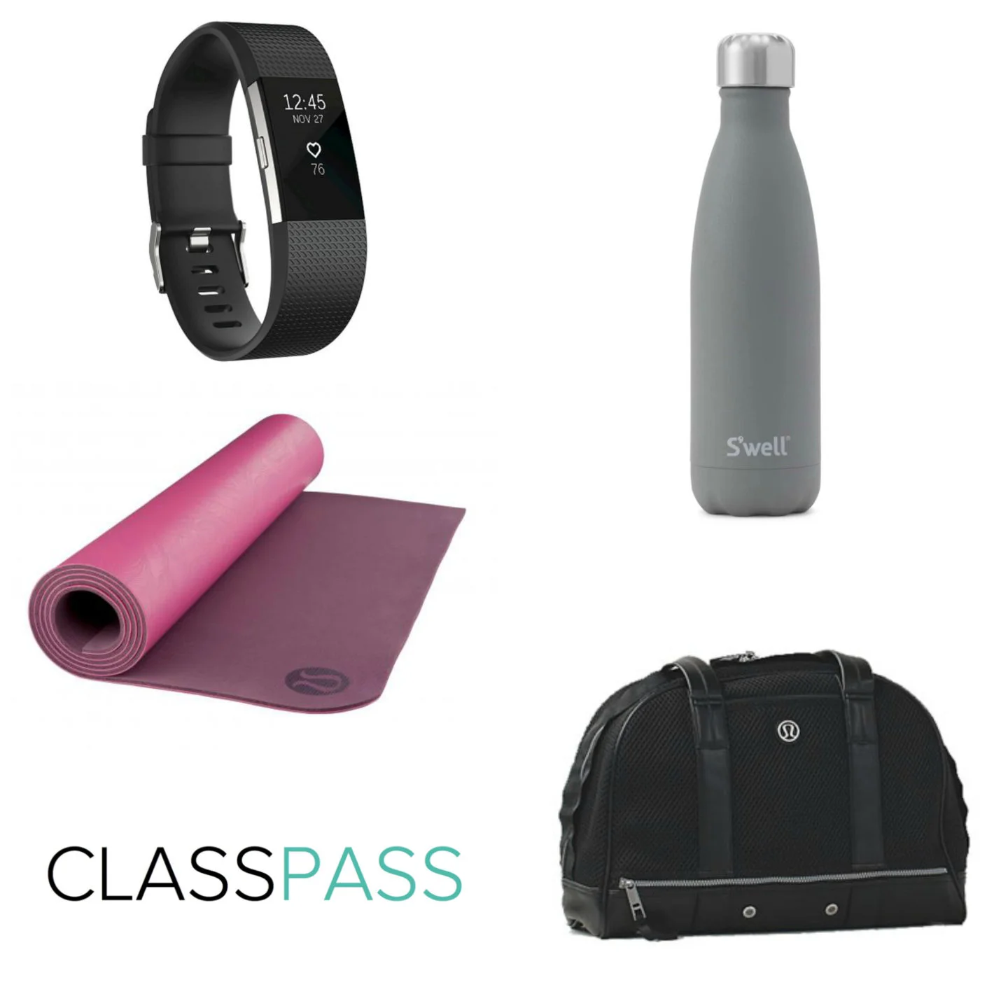 Fitbit // Swell Water Bottle // Namastay Mat // ClassPass // Free To Be Bag